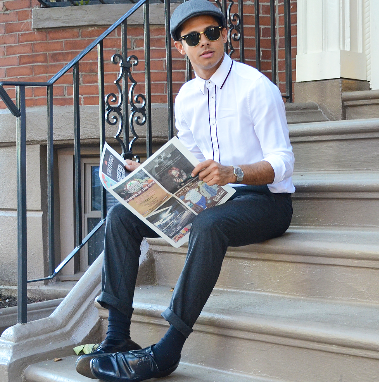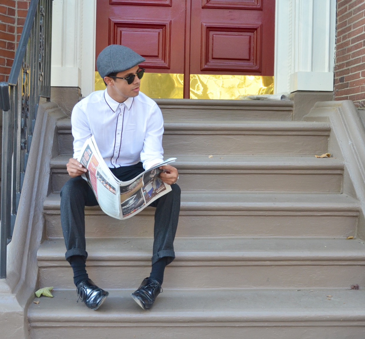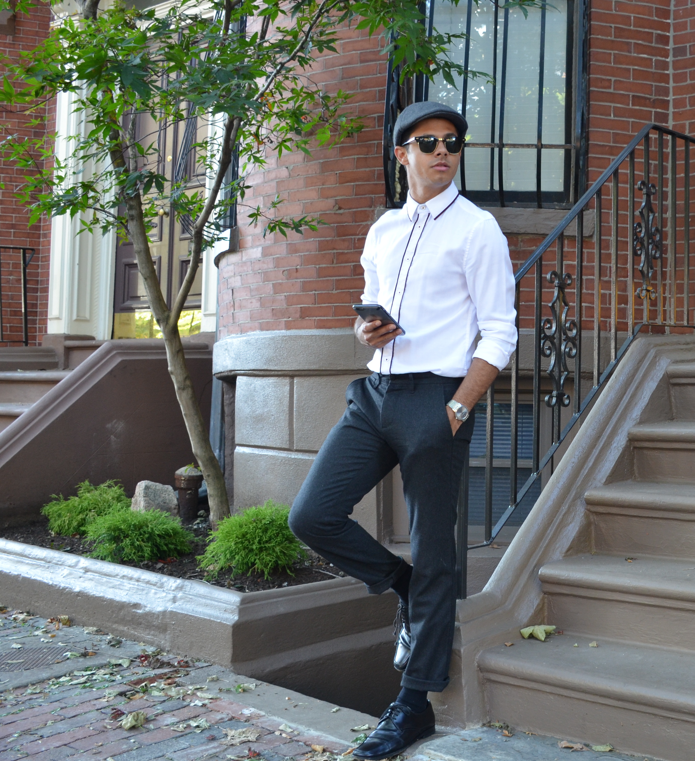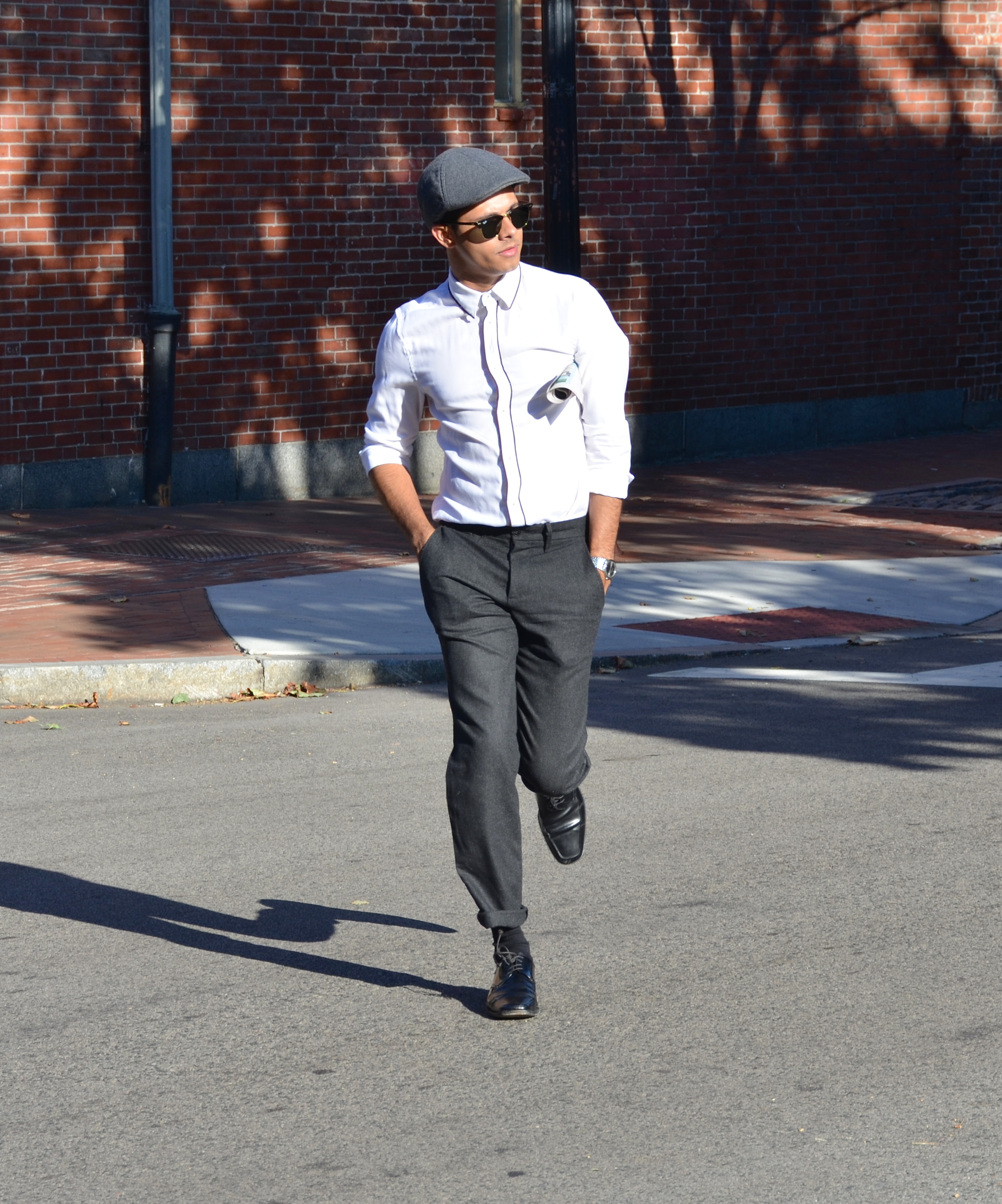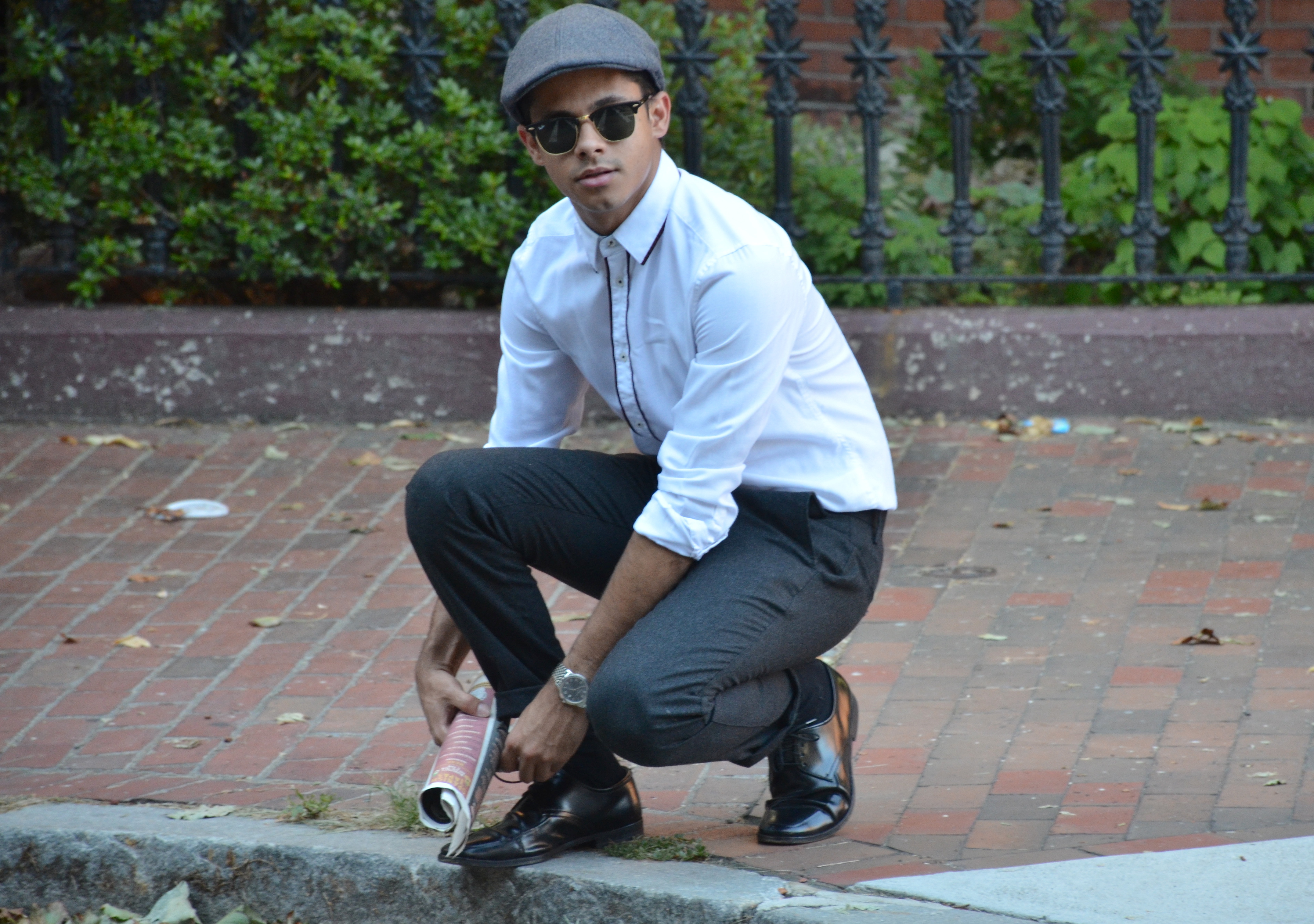 Anyone who knows me knows that I can be described as old-fashioned. From my taste in music to my taste in art, I love things from the past and often feel like I was born in the era. This week I channeled my affection for old-fashioned things into my outfit. My look resembles something that would likely be found on the streets of New York City during the Roaring Twenties or in Paris decades ago. As people say, fashion repeat itself and this look that was popular so long ago is still trendy today. I chose a white H&M button-up that had brown trim. The trim really added to the classic look and made a simple white shirt stand out as sophisticated. Gap made these really awesome vintage trousers that I found for a great price. I love the unique color and they fit perfectly. The perfect shoes to pair with this look were a pair of Prada’s. I completed the ensemble with what I know as a flat cap. This kind of hat is known by dozens of different names including a cabbie cap, bicycle cap, scally cap, and many others. Regardless of what you call it, this hat has been around for centuries and surged in popularity during the twenties. In recent times, public figures such as David Beckham have worn this hat numerous times. Altogether, this look may seem like something pulled from nearly a century ago, but this would be a great outfit to wear for a night out in the twenty-first century. To separate yourselves from others even more, pair this look with some suspenders and a cute bow tie! Do not be afraid to look back in history for an outfit for today!